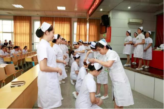 68名新入职的护士屈膝、低头,虔诚地接受纪委书记罗敏及内科片、外科片、五妇中片、护理部的护理专家们为她们授帽,并在罗敏的带领下重温南丁格尔誓言。