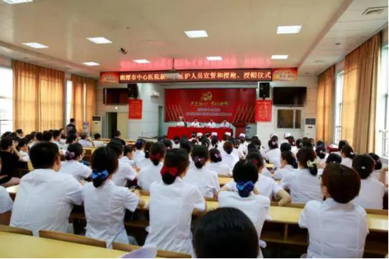 “健康所系,性命相托!我将竭尽全力,除人类之病痛,助健康之完美,维护医学的圣洁和荣誉......”“终身纯洁,忠贞职守。勿为有损之事,勿取服或故用有害之药......”誓词振振,白袍加身。7月5日,湘潭市中心医院在学术报告厅举行新入职医护人员宣誓和白袍授予活动,党委书记夏红、副院长王锡榜、纪委书记罗敏出席活动,活动由副院长唐新桥主持。身穿天使服装、着装整齐的2017年新入职的医生、护士共131人参加活动。